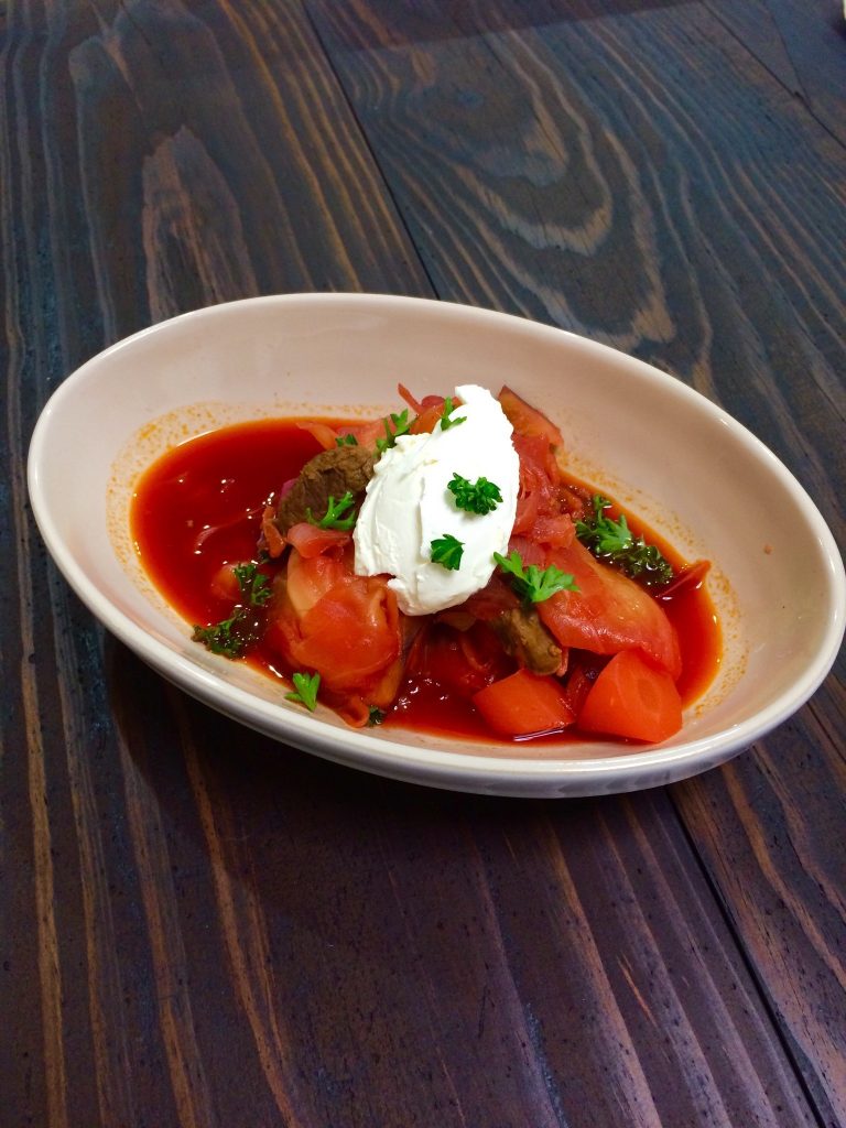 牛肉がたっぷり入っているのでメインディッシュにもなります。少し酸味のあるスープとサワークリームの相性は抜群です。